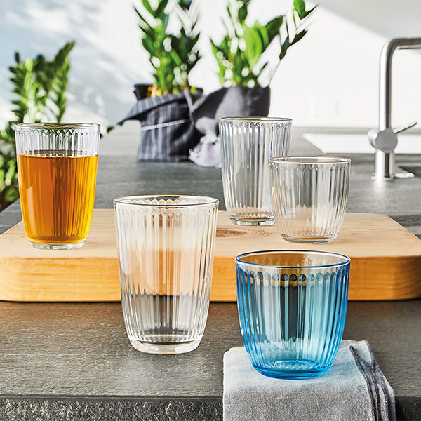 The glass is crossed by dense grooves that draw a striped pattern, adding a sparkling and casual note to the table.