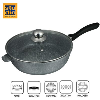Studio House high quality die-cast non-stick cookware line Domus is the perfect value for money cookware available. Heavy Duty, professional, long lasting quality pressure die-cast aluminium. Thick construction that retains heat well. Perfect flat induction base, energy saving, easy and fast cooking. Top quality long-lasting two-layer interior non-stick coating. Easy clean interior & exterior. Break resistant clear glass lid. Dishwasher safe. Ideal for fat free cooking and healthier diet.