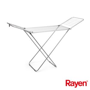 Smart pegless clothes drying frame from Rayen. 18m of clothes hanging space. Firm grip without pegs. No peg marks on the clothes after drying. Criscross grip system. Perfect to any area: Indoors or outdoors. With wheels for easy moving, Safety hinges and feet for greater stability.